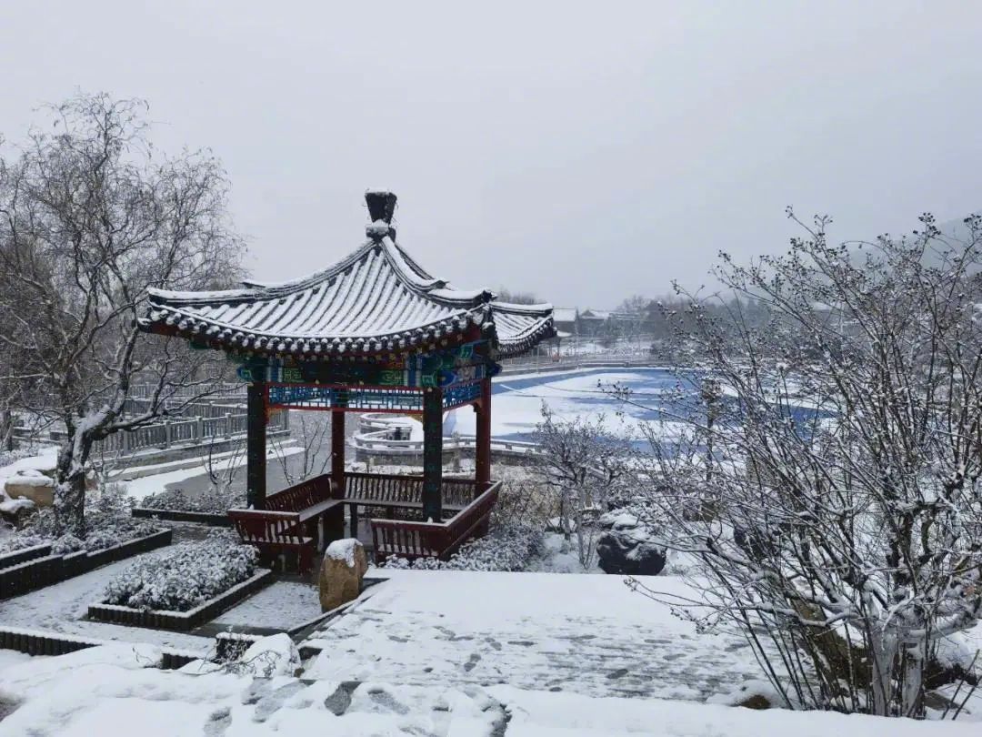 在公园中亭台楼阁的映衬下,有着无尽的诗情与画意。当站在虎山阁中远眺,山中有雪,雪中露山,广阔的公园显得格外美丽动人。