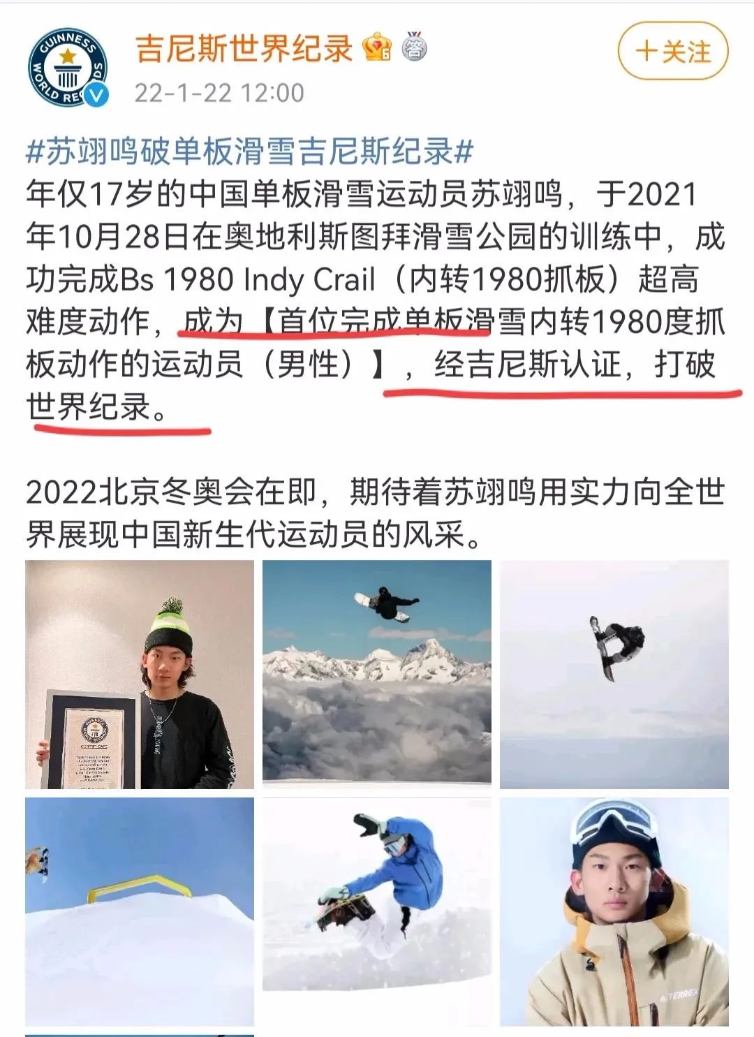 去年10月,苏翊鸣成为“首位完成单板滑雪内转1980度抓板动作的运动员(男性)”,经吉尼斯认证,打破世界纪录。