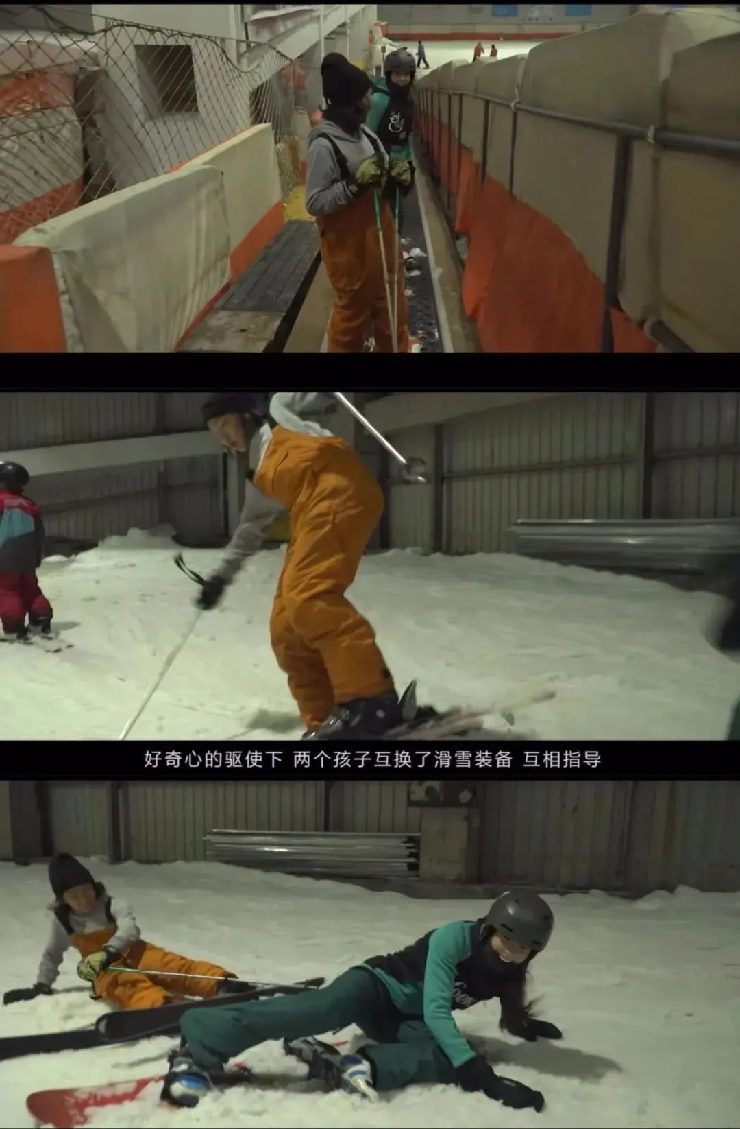 在滑雪场上,他们还互相玩起了对方的训练项目,因为一个单板一个双板,俩人互换装备,摔倒了也很开心,因为是在做热爱的事。
