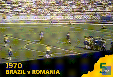 ▲1970年世界杯,贝利直接任意球攻破罗马尼亚球门。
