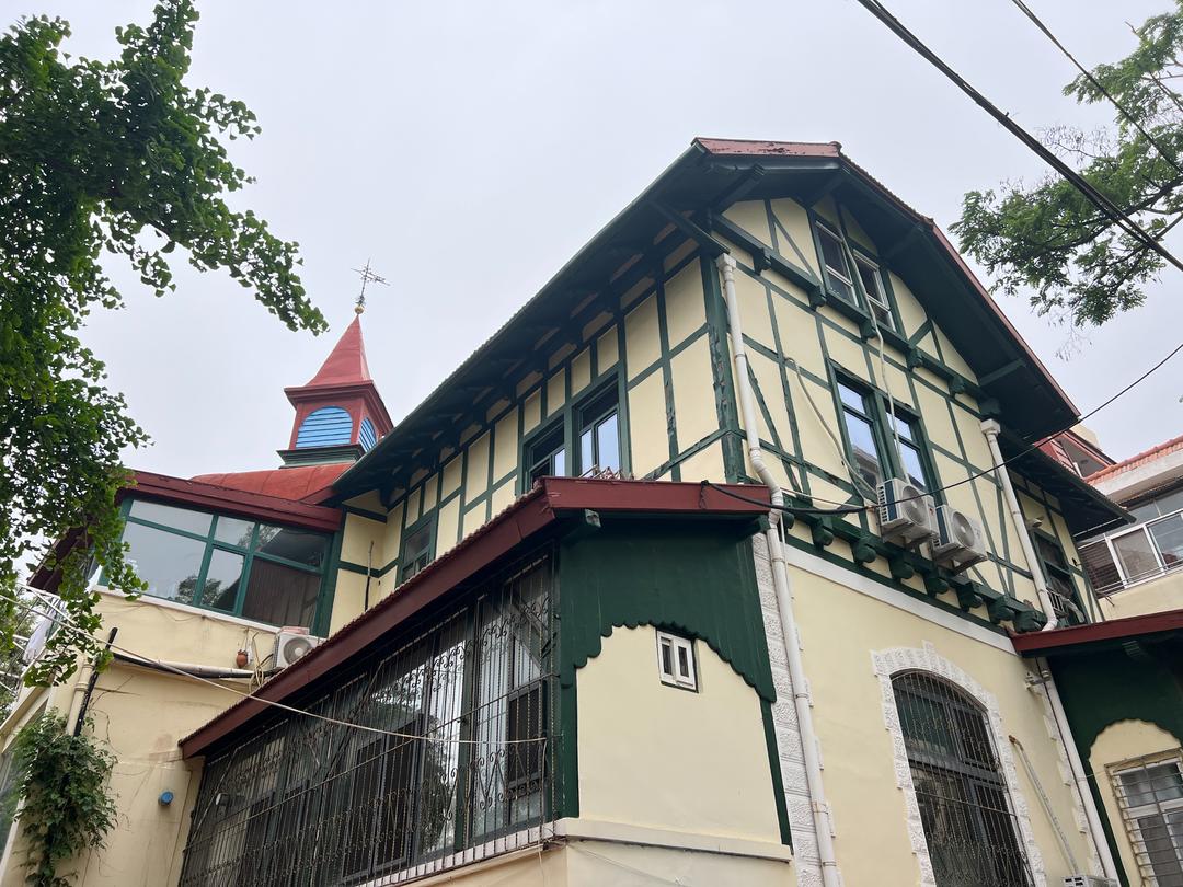 进入3号并不困难。始建于1901年的建筑,带有明显的中式风格。石头台阶砌成的山梯,为市民铺开了一条方便的胡同,庭院绿树环绕,月季开得正艳,高矮的错层院落,用竹子将外界的嘈杂与庭院分离开来。一处小菜园,有人在忙碌。中西结合的别墅建筑,在沂水路风格鲜明,铁艺风向标很是精美。这栋建筑又称为盖尔普克亲王别墅,由德国人马克思·科偌普夫设计。后来,是升允的王邸。