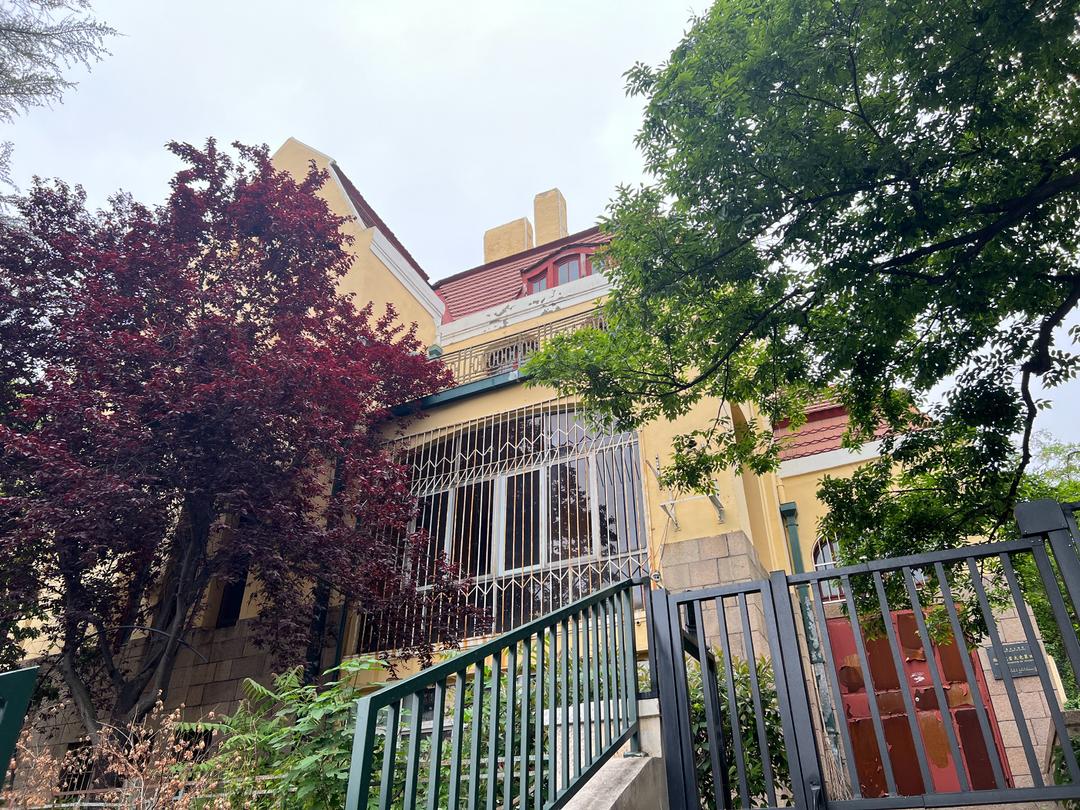 房前屋后的群树掩映着一座造型美观的三层欧式建筑,始建于1907年,为政府官员寓所。1934年在东面接建了翼楼,英国领事馆初在湖南路9号,后升格为总领事馆,迁至沂水路14号。106岁的紫藤在门口的通道上,蜿蜒向上,仿佛一条古老的时光隧道,引领着人们穿越岁月的长河。这棵紫藤见证了无数人的来来往往,也见证了城市的变迁。