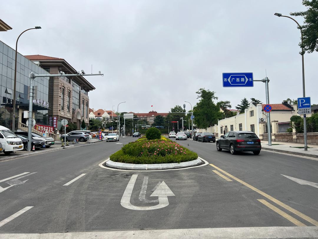 在广场上,俯视青岛路,这里频频登上热门话题,一眼到海的辽阔,和花坛、建筑、道路、人的和谐,是天然的画卷。